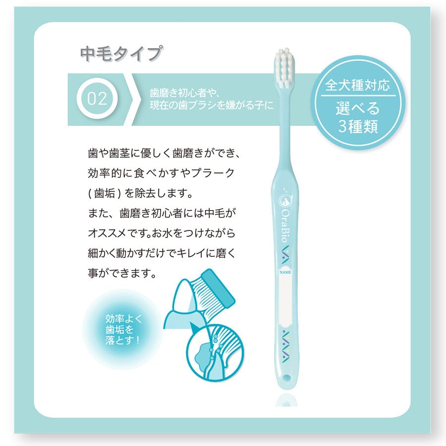 一般的な子供用歯ブラシの5倍以上、約4,200本の毛を備え、”羽”のように柔らかい0.07mm毛が密集しているので、毎日の歯磨きが苦にならないペットのお口に優しい歯ブラシです。
